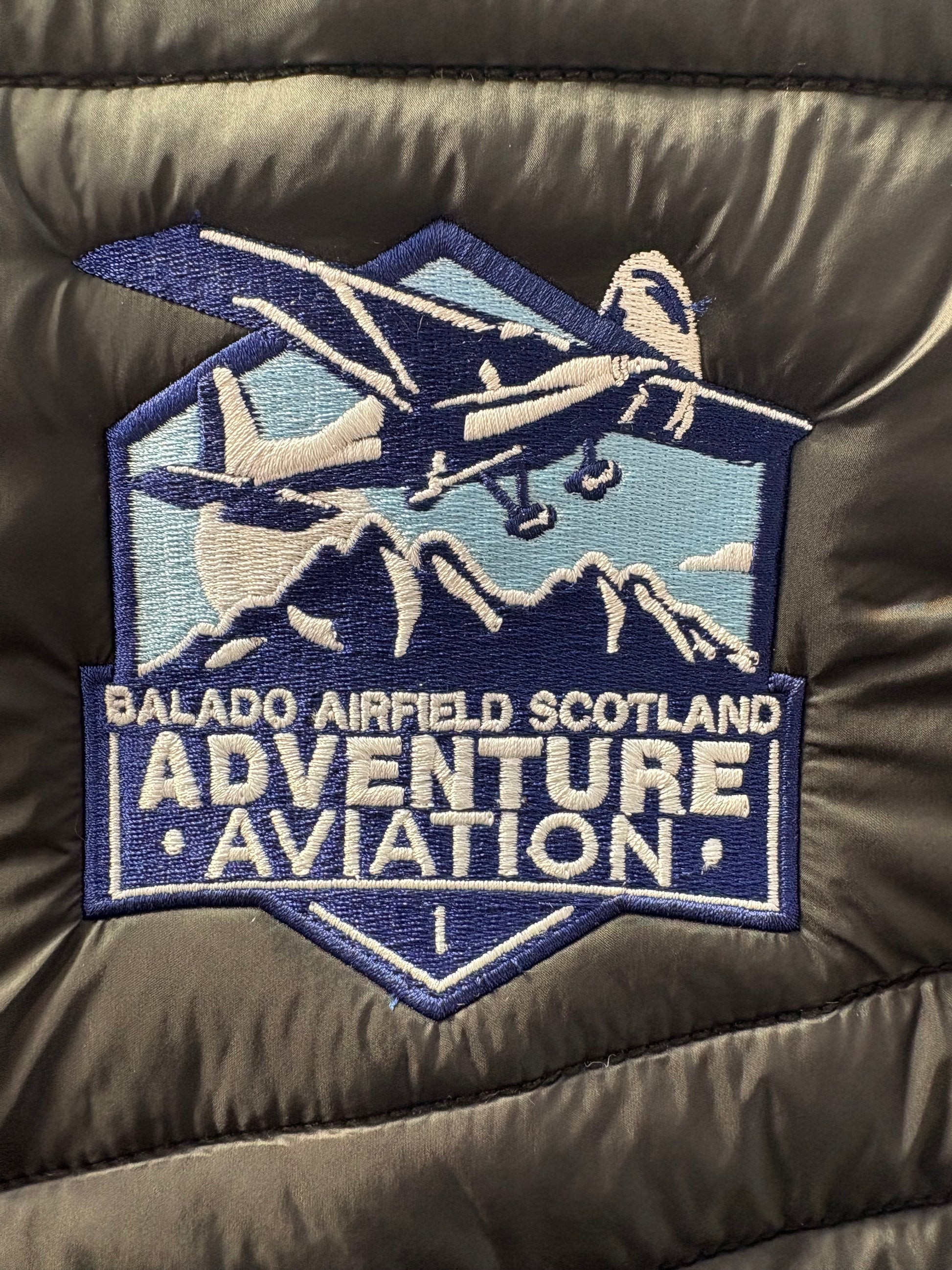 Black body warmer with blue trim and embroidered Adventure Aviation logo